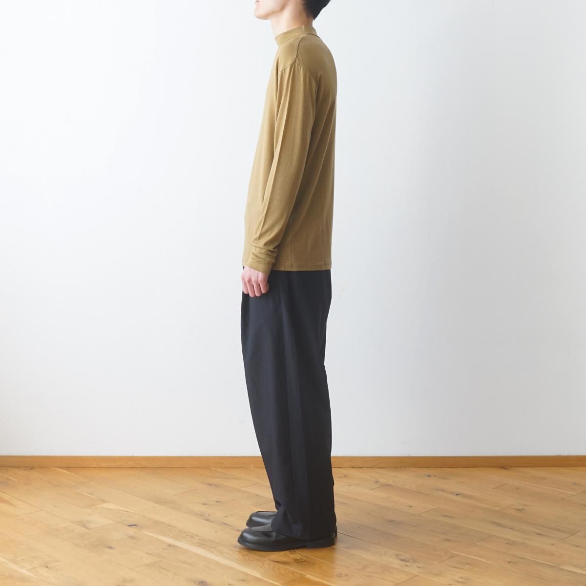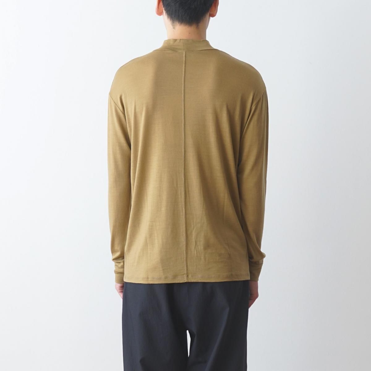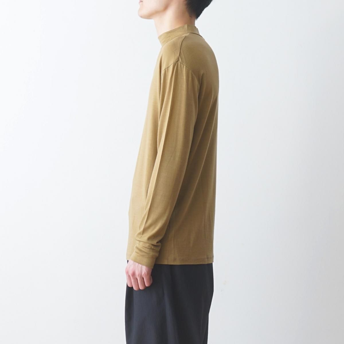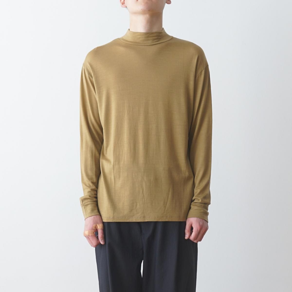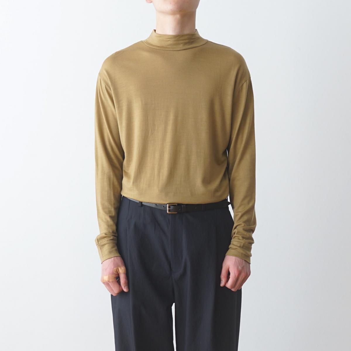 ややリラックス感のあるボトルネックのTシャツです。細身のシルエットでインナーとしても使うことができます。ウールの上品な素材感と合わさった一枚です。また、ウォッシャブル加工を施しているためご家庭での洗濯が可能です。