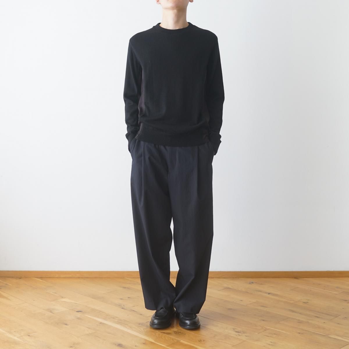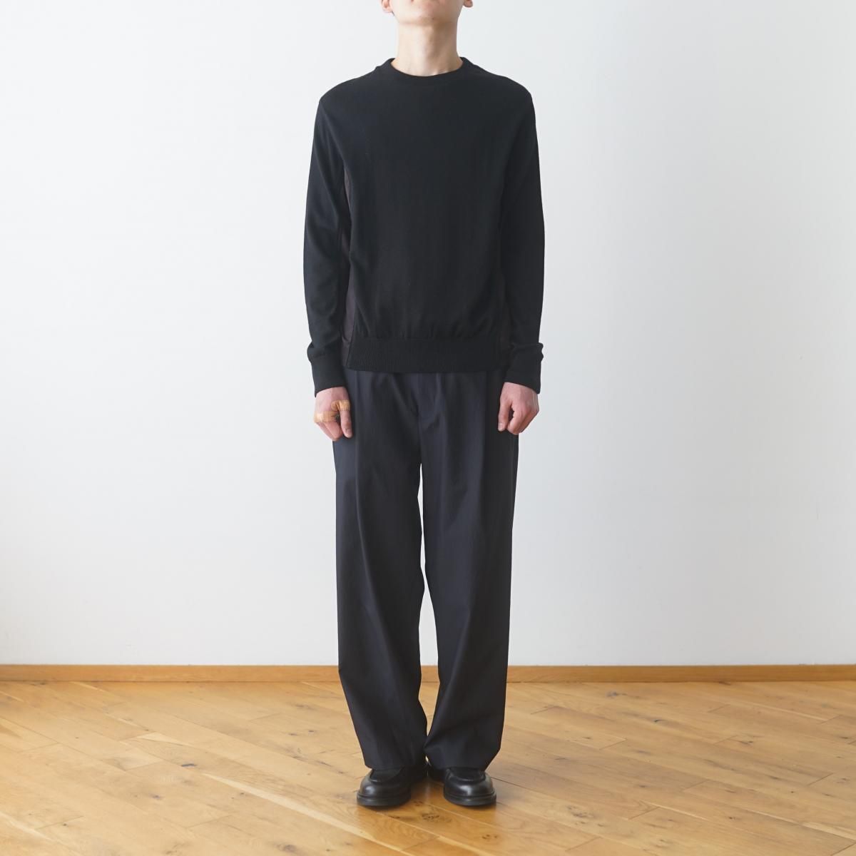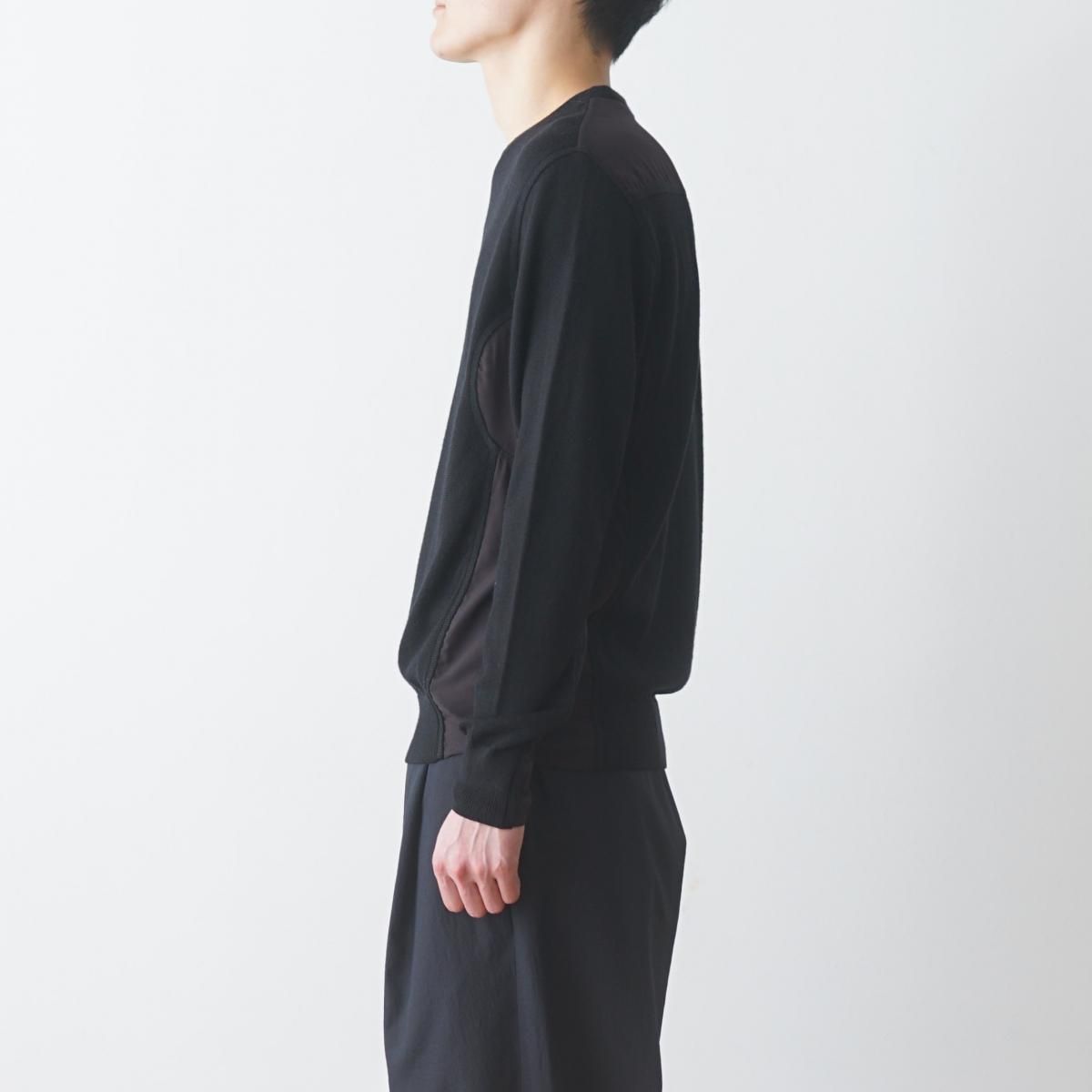 こちらのクルーネックニットは強撚糸を使用しており、ドライな肌触りが魅力となっています。モッズコートなどミリタリーアイテムのライナーをイメージしたサイドの切り替えにはオリジナルの布帛生地を使用しており、二ドム加工を施す事で微起毛感と独特のヌメリ感があります。アームホール部分を半分開ける事でパネル部分に布帛を使用していてもストレスなく着用できます。