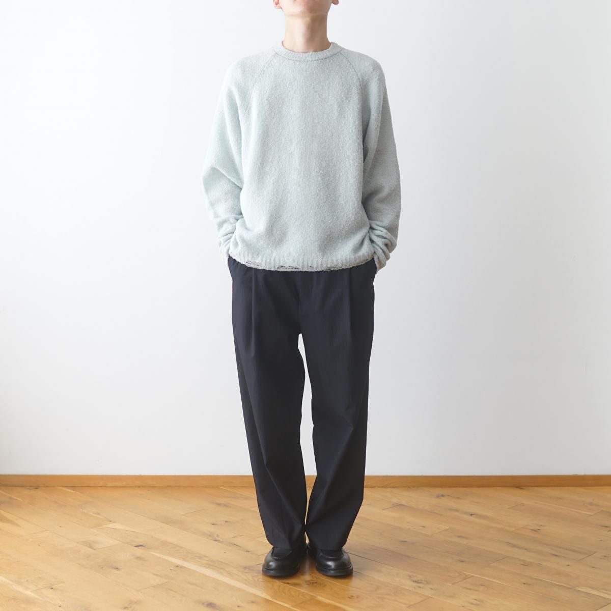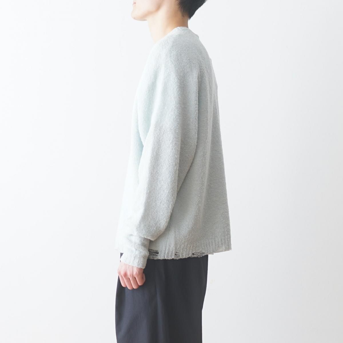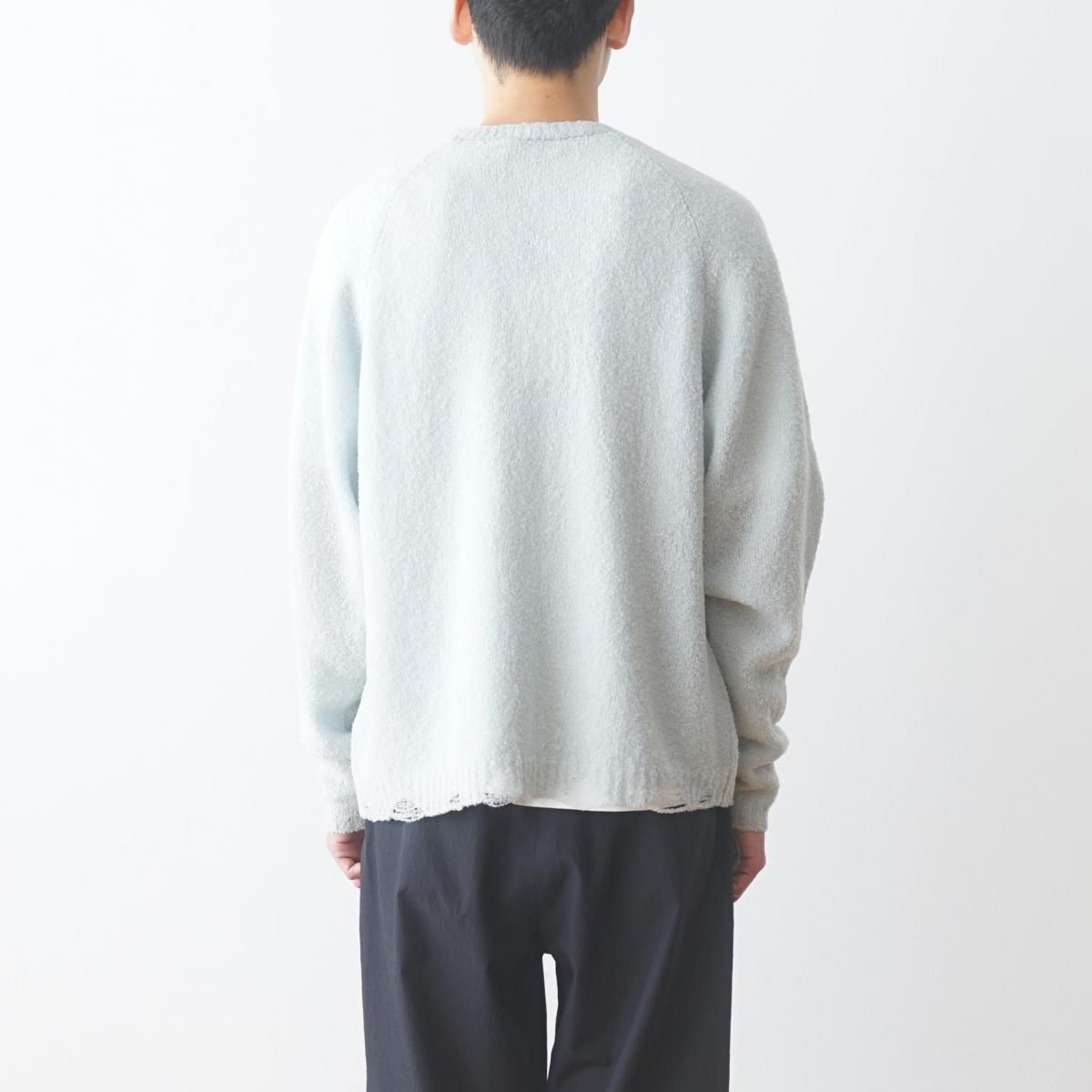 裾にダメージデザインを施し、ルーズなシルエットで仕上げたクルーネックニットです。ジャガードでダメージを表現しているため、ほつれる心配もありません。空気を多く含み、ふっくらとした非常に軽量な仕上がりとなっております。