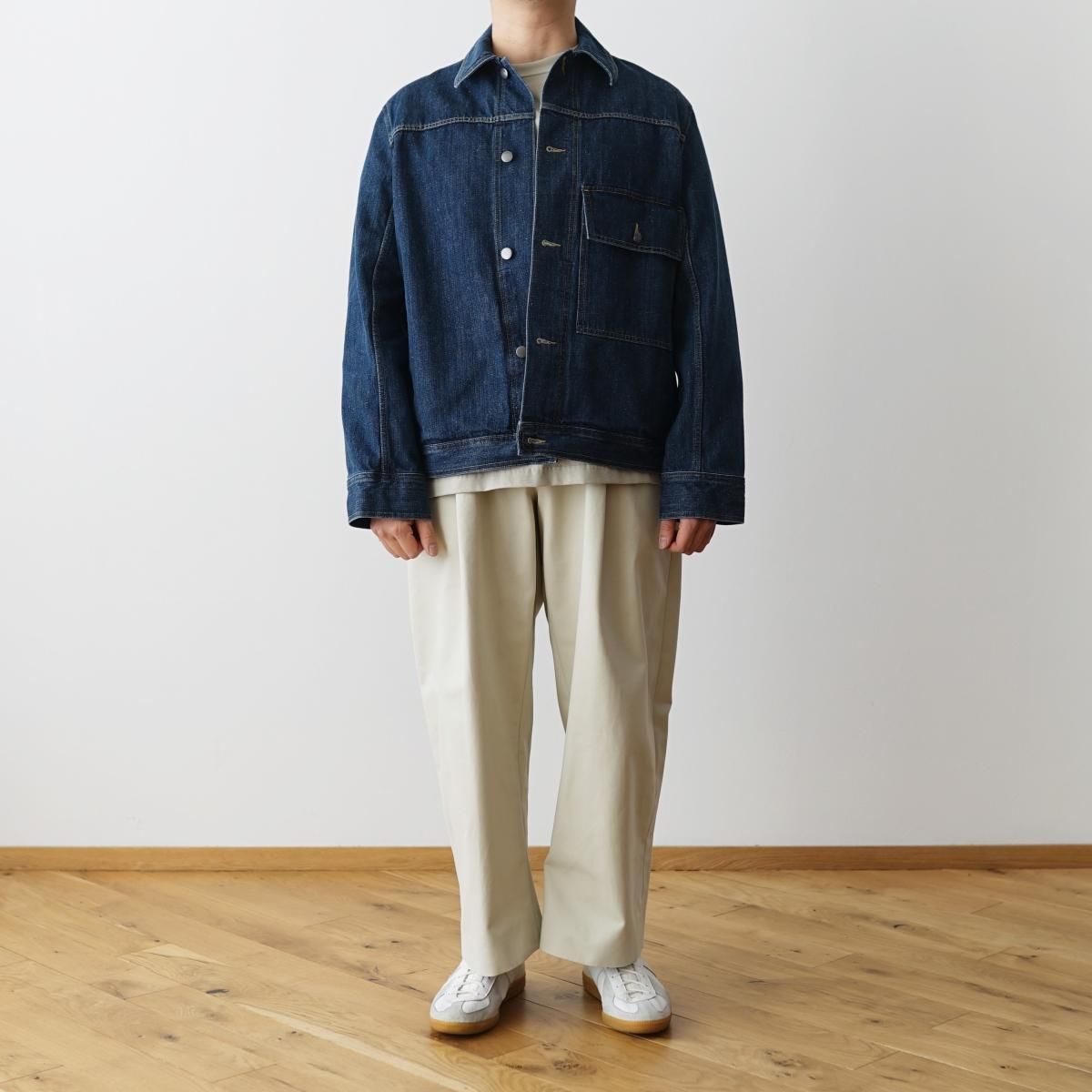 スタジオニコルソンの新定番のデニムジャケット「LAZER」。大振りなディティールや、独特なパターンが印象的な一枚です。フロントは片ポケにして大きなフラップ、腰にはハンドウォーマーポケットを設け、背面には縦にプリーツを入れています。古いミリタリーなどで稀にある縦のプリーツは、腕を前に出しやすくするアクションプリーツの役目も果たします。サイズ感は身頃たっぷりで、丈もデニムジャケットの中では長めに設定。迫力のあるシルエットがスタジオニコルソンらしい一枚です。