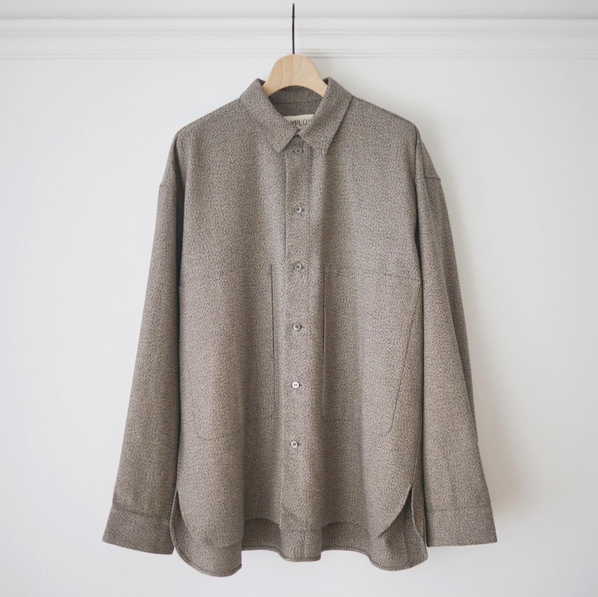 POLYPLOIDの定番モデルである、シャツジャケットのご紹介です。シャツのデザイン(セミワイドカラー・小振り目なボタン・前後の見頃に段差をつけたラウンド型の裾)とジャケットのデザイン(たっぷりとした肩幅・身幅と襟元のカッティング)が融合したモダンでミニマルなシャツジャケットに仕上がっておます。胸元に大きくあしらわれた両胸の二つのポケットが印象的で、他とシャツとの違いを引き立たせます。ライトアウター感覚で着用出来るシルエットの為、インナーにスウェットやニットなど入れてライトアウター感覚でもお使い頂けます。