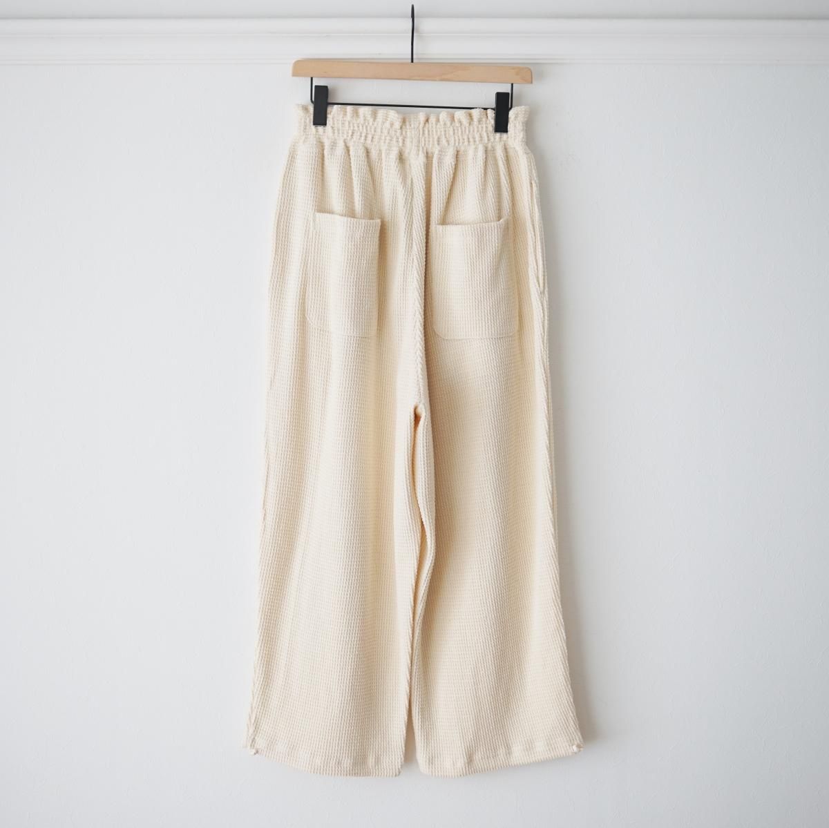 ミリタリーウェアやワークウェアで見られる、生地を2重にし補強と防寒の意味を持つ特徴的なディテールをステッチワークのみで表現したワッフルパンツです。ざっくりとしたサイズ感で裾口のドローコードも特徴です。