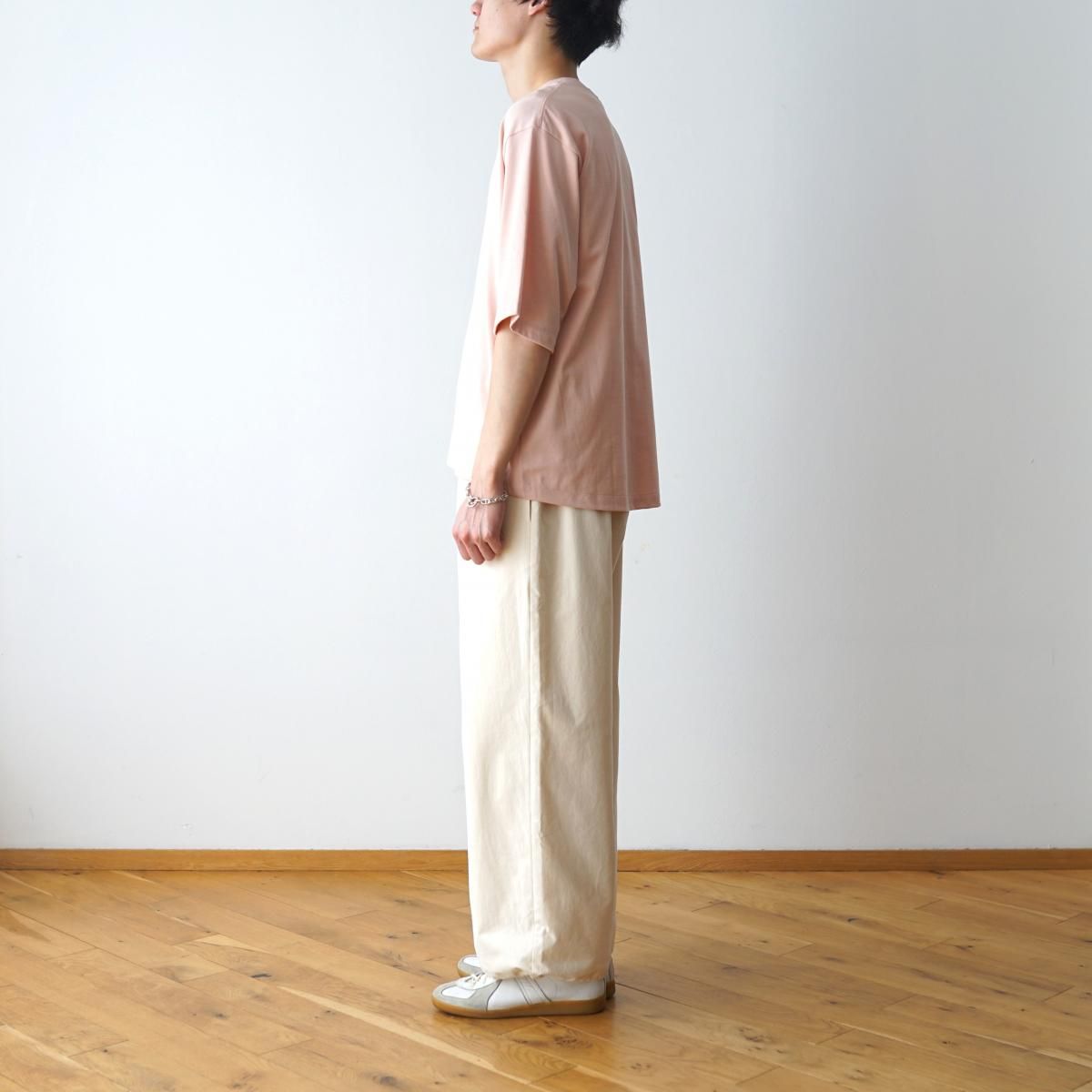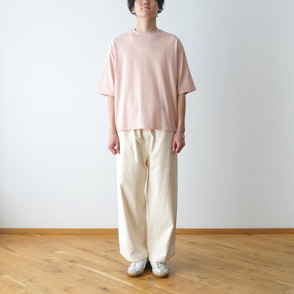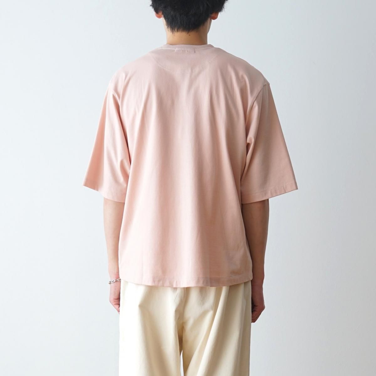 POLYPLOIDのT-SHIRTのご紹介です。形は肩や身頃にゆとりをもたせたボックス型で、アームホールも太めにデザインし、全体的にゆったりとしたシルエットに仕上げています。着丈は前後で若干の高低差を付けており、程よくアクセントを効かせています。しっかりした厚みとハリのある生地にオーバーサイズのシルエットが加わることで、スウェットやニット感覚でスタイリングできる存在感のある1着に仕上げています。ご家庭で水洗いができることもポイントです。
