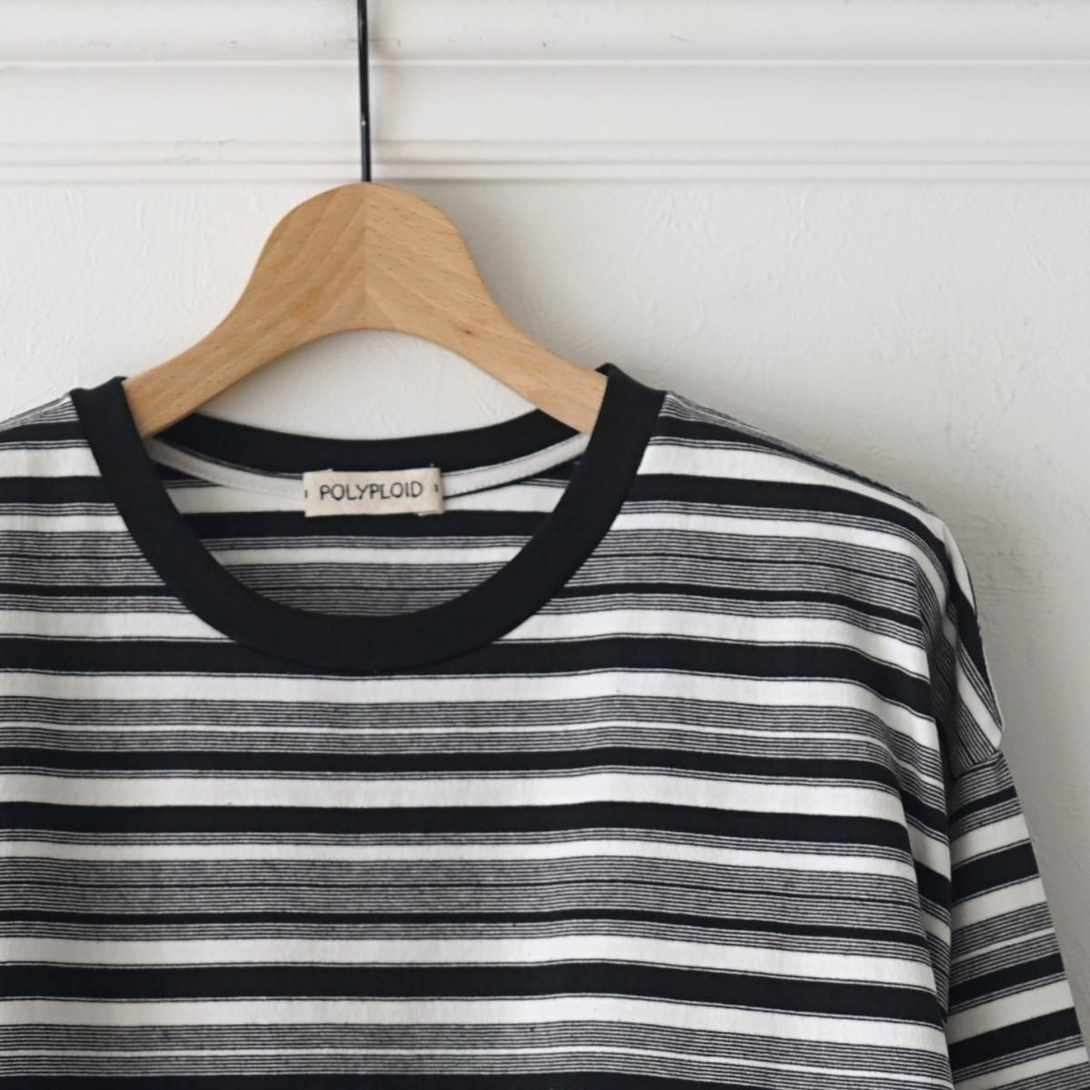 POLYPLOIDの定番モデルである、オーバーサイズロングスリーブのご紹介です。形は肩や身頃にゆとりをもたせたボックス型で、アームホールも太めにデザインし、全体的にゆったりとしたシルエットに仕上げています。着丈は前後で若干の高低差を付けており、程よくアクセントを効かせています。しっかりした厚みとハリのある生地にオーバーサイズのシルエットが加わることで、スウェットやニット感覚でスタイリングできる存在感のある1着に仕上げています。ご家庭で水洗いができることもポイントです。
