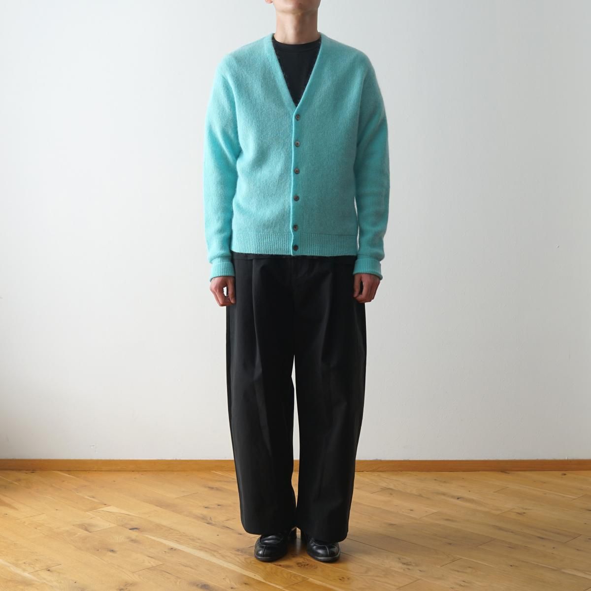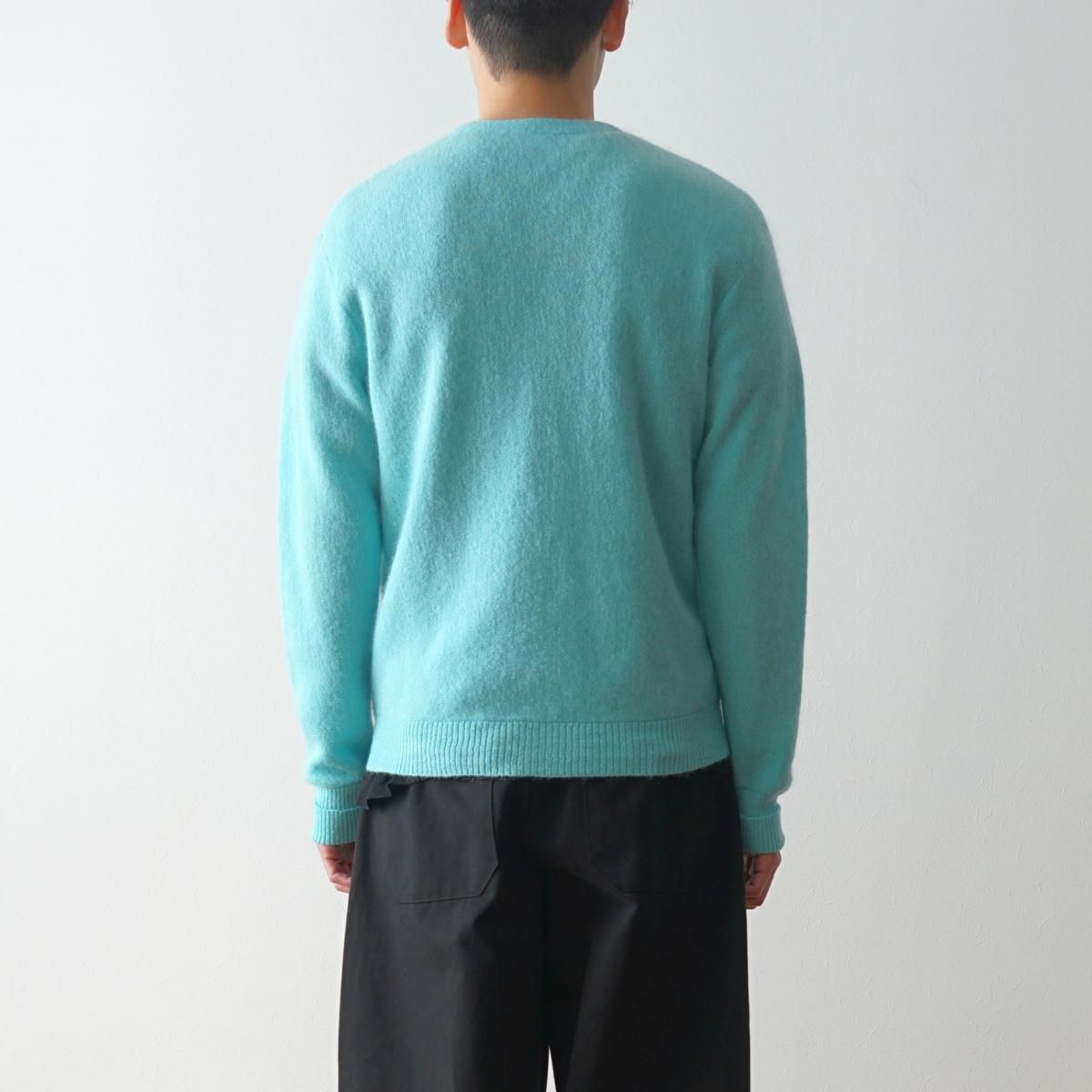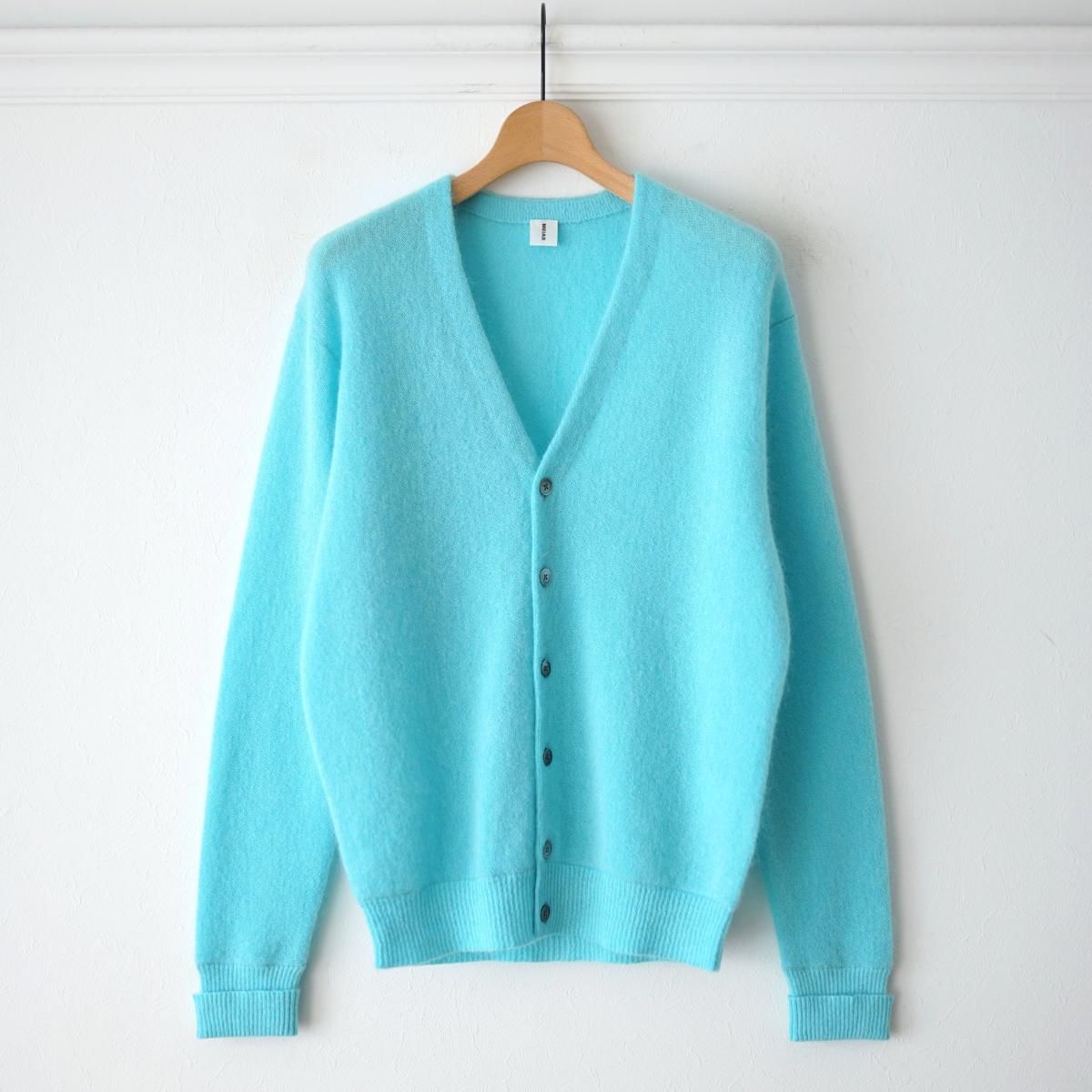 スーパーキッドモヘヤを贅沢にお楽しみ頂けるように5Gの片畦でお作りしたVネックカーディガンです。モヘヤの毛が最大限に吹く編み方の片畦を選定する事によって縮絨のみでモヘヤの毛を出しました。アームホール、袖下、脇は丁寧に3山分の畦目を立てた目立てをし、前立て裏の総針テープのみ1段階薄い7Gにする事によってスッキリと仕上がります。細部まで丁寧に編み立てました。リンキング糸は前立て以外を配色の異素材を使用しており、アームホールは外出しのリンキングで目を引くデザインです。Vネックの深さは何度も検討して深すぎず、浅すぎず飽きのこないバランスを探しました。軽くて暖かい、さっと羽織るだけで様になるカーディガンです。