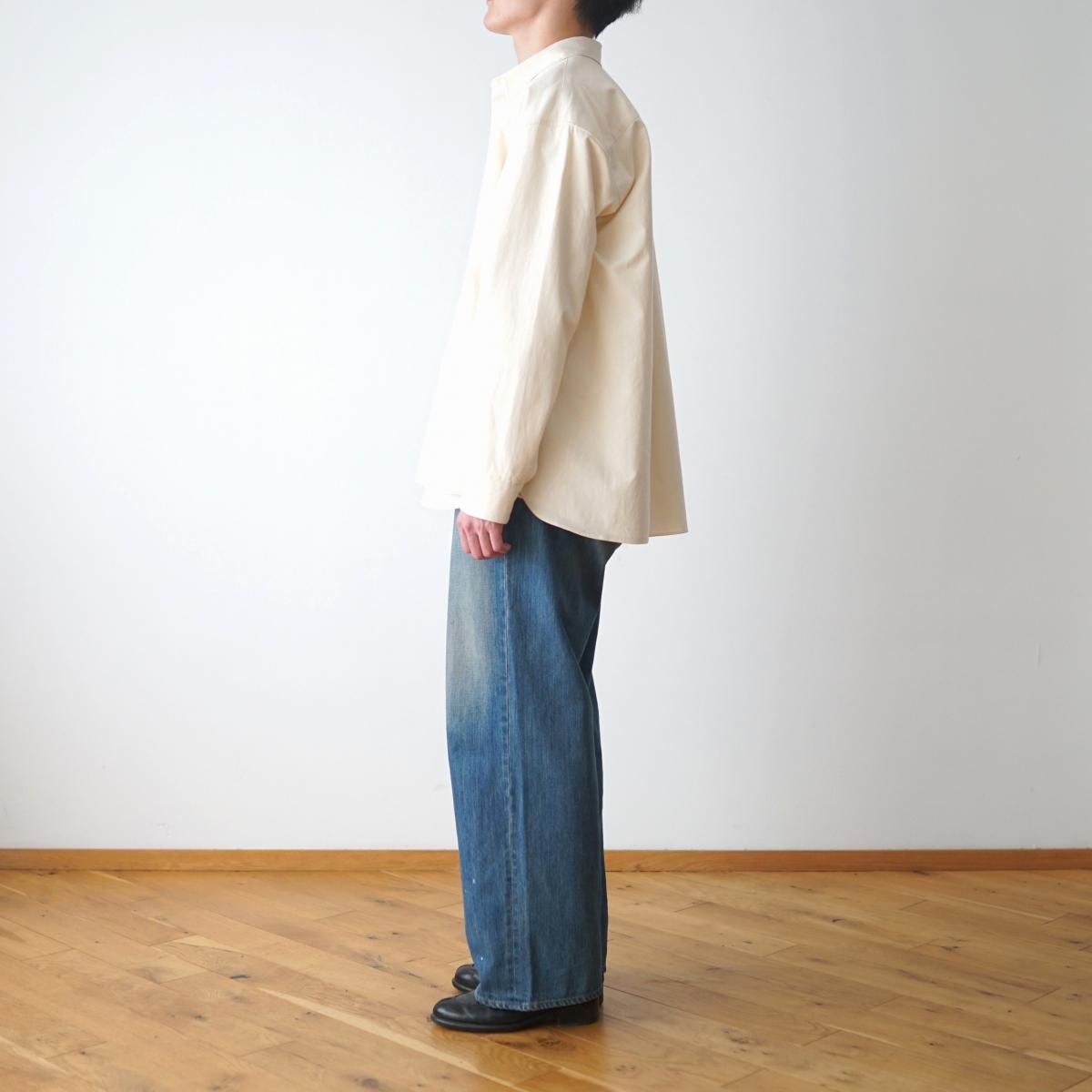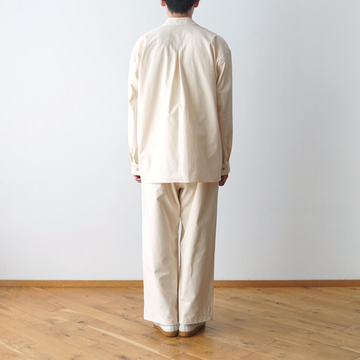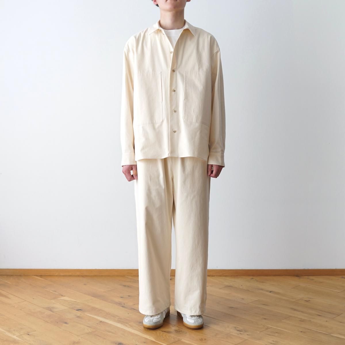 イギリス製のネップ感のあるナチュラルコットンをドイツの工場で特殊な水洗いを施し、小じわをつけて生地に動きを出しています。現地では「calico」とも呼ばれるこの生地は、素朴で奥行きのある表情豊かな風合いが特徴で、確かな経年変化を魅せてくれます。