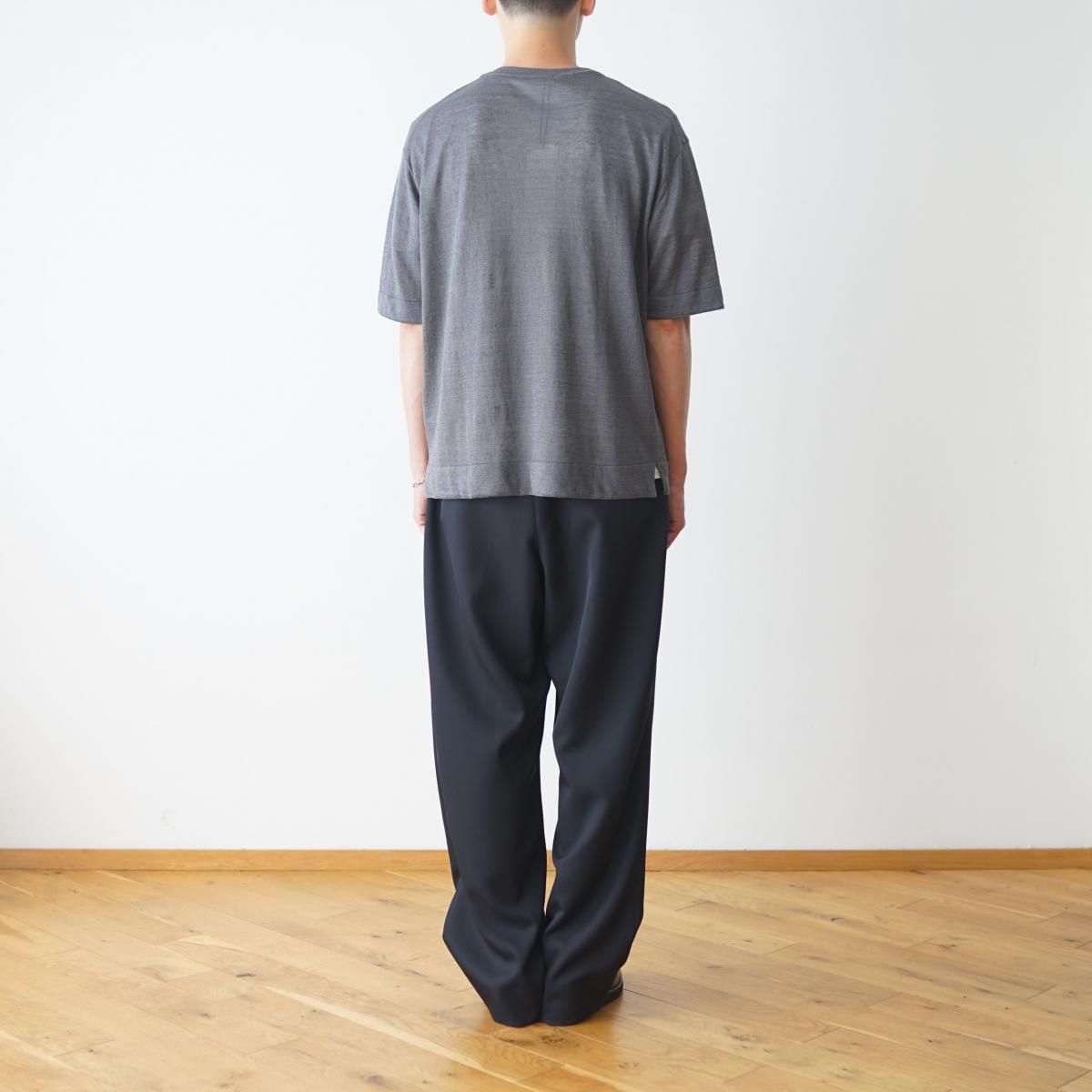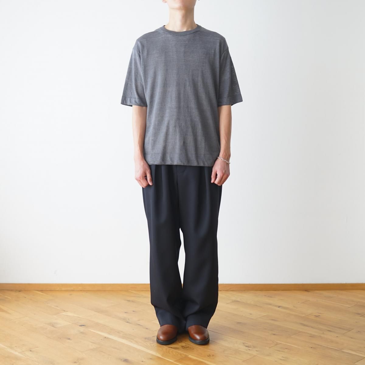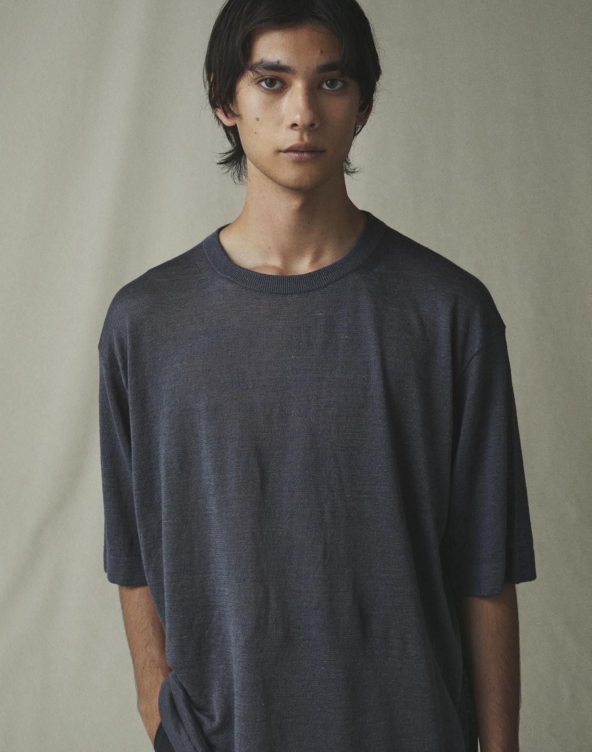 The CLASIK のシルクリネンを使用した清涼感ある KNIT T-SHIRTS です。やや詰まったネックと太めに取られた袖と裾のステッチ幅が、シンプルながらデザインのアクセントになっております。ゆったりとしたボックスシルエットで袖丈は長めのシルエットです。