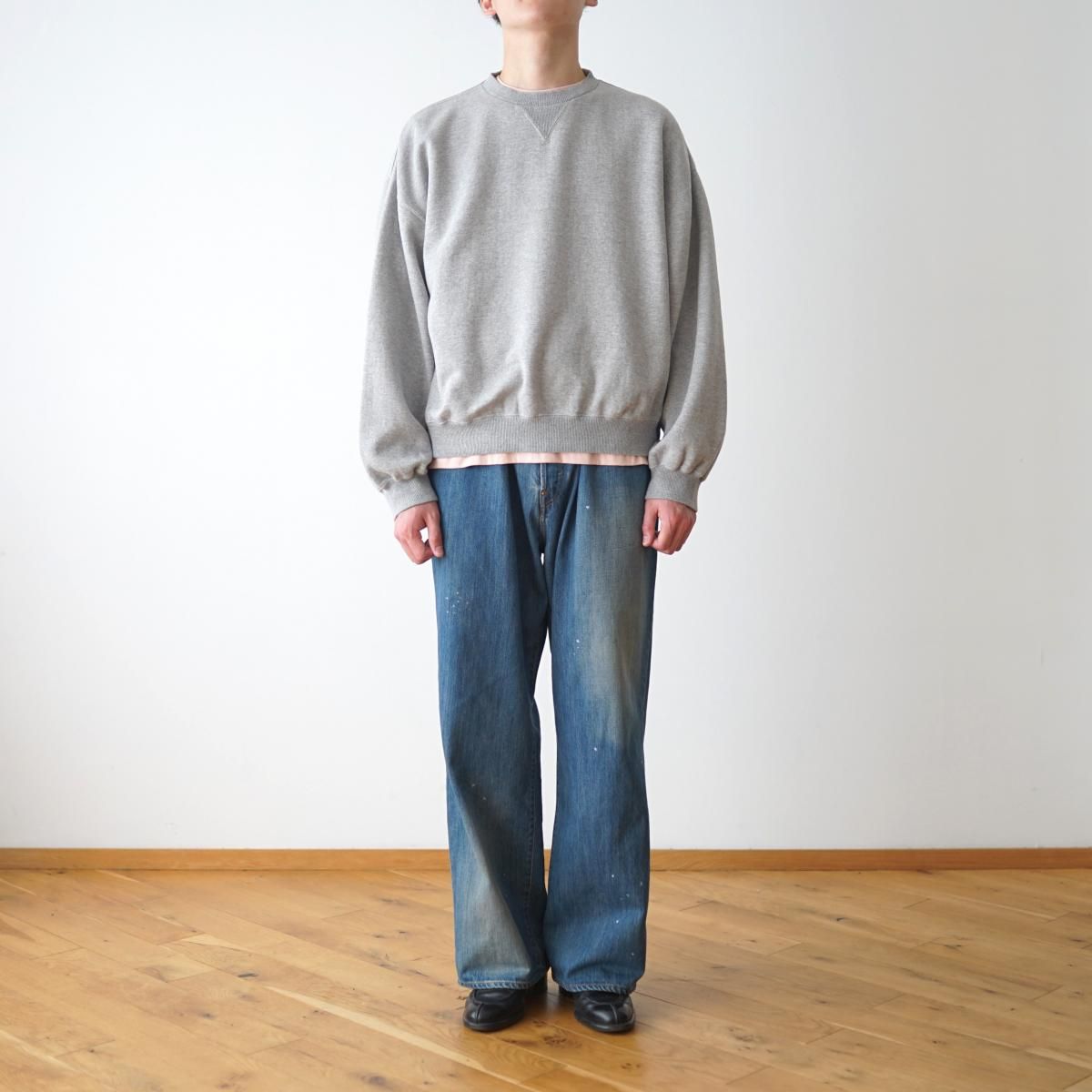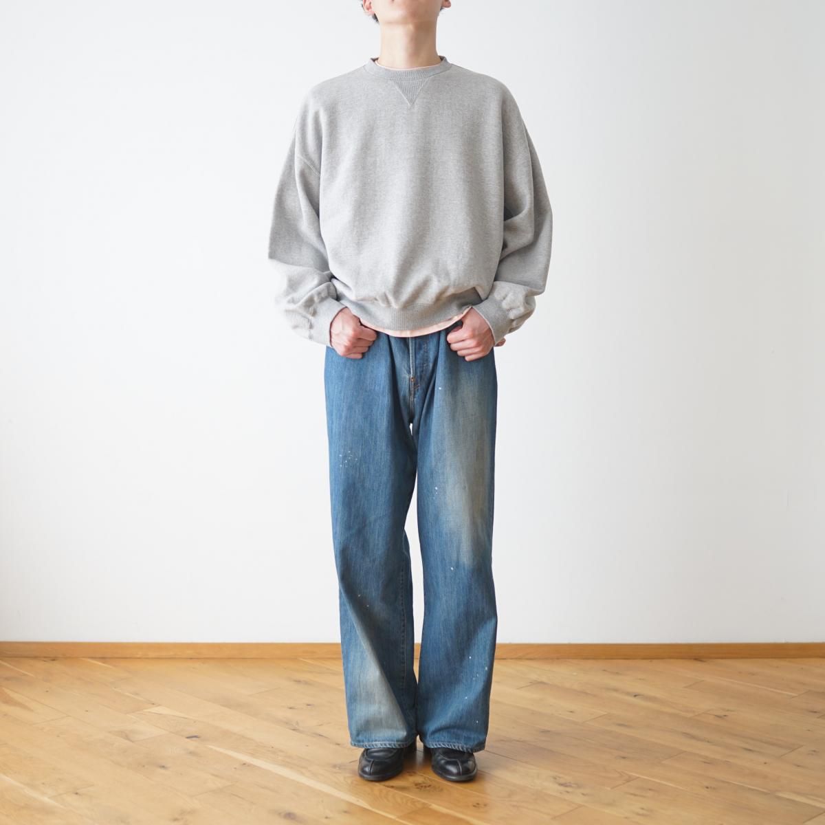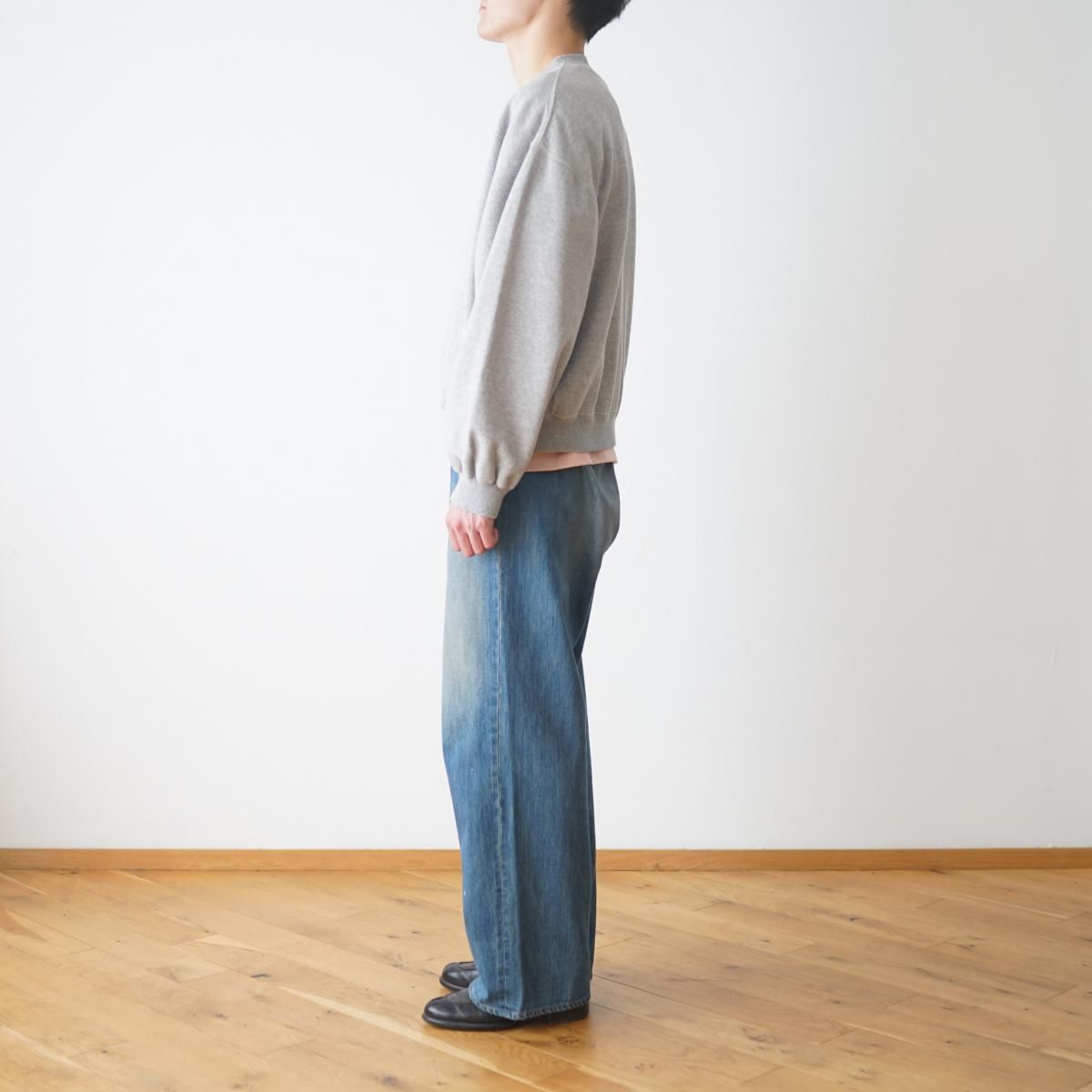 素材はヴィンテージスウェットの劣化した風合いを目指して製作した裏毛を使用しています。元々は裏起毛だった素材を、起毛がなくなるまで洗い込みヴィンテージさながらの風合いに仕上げています。