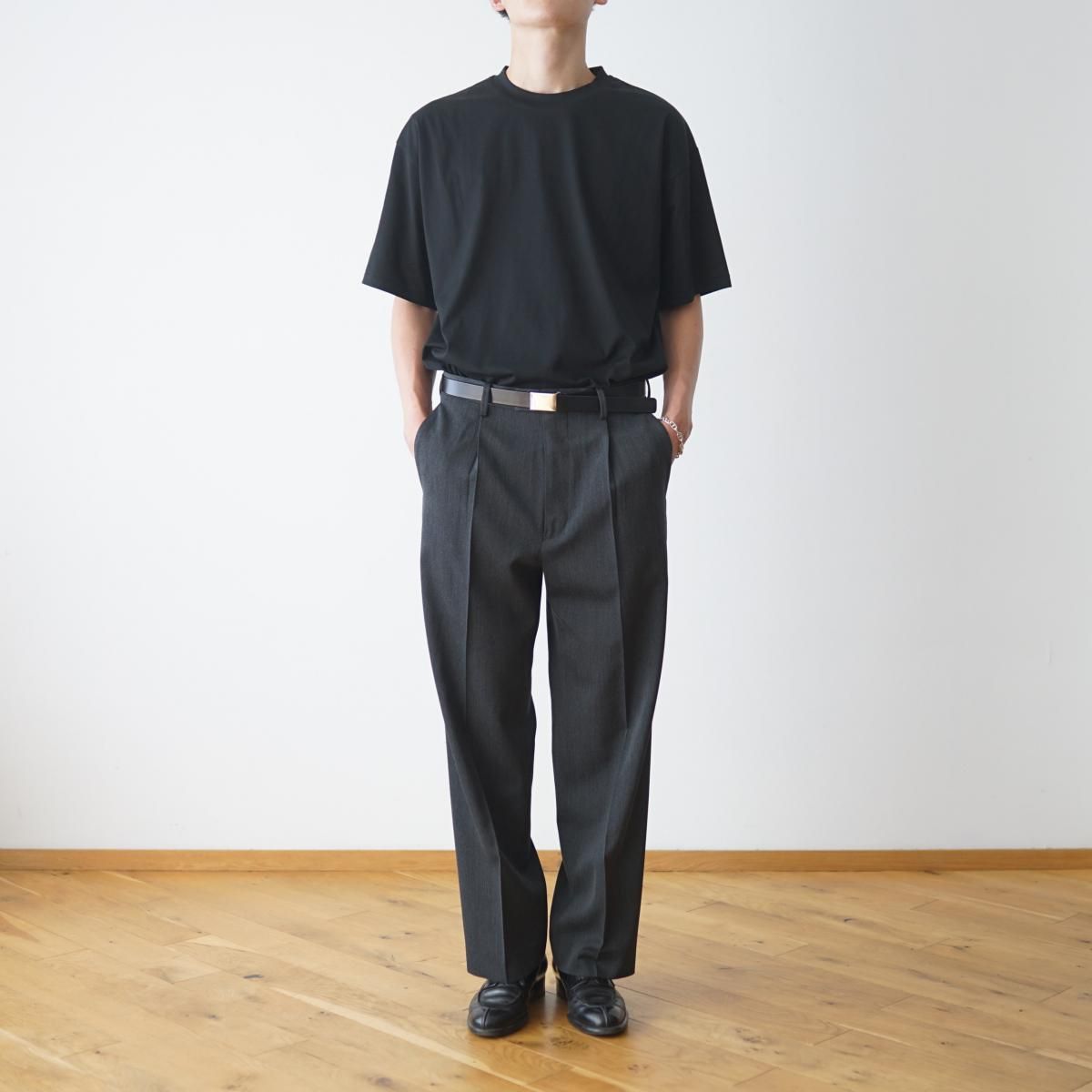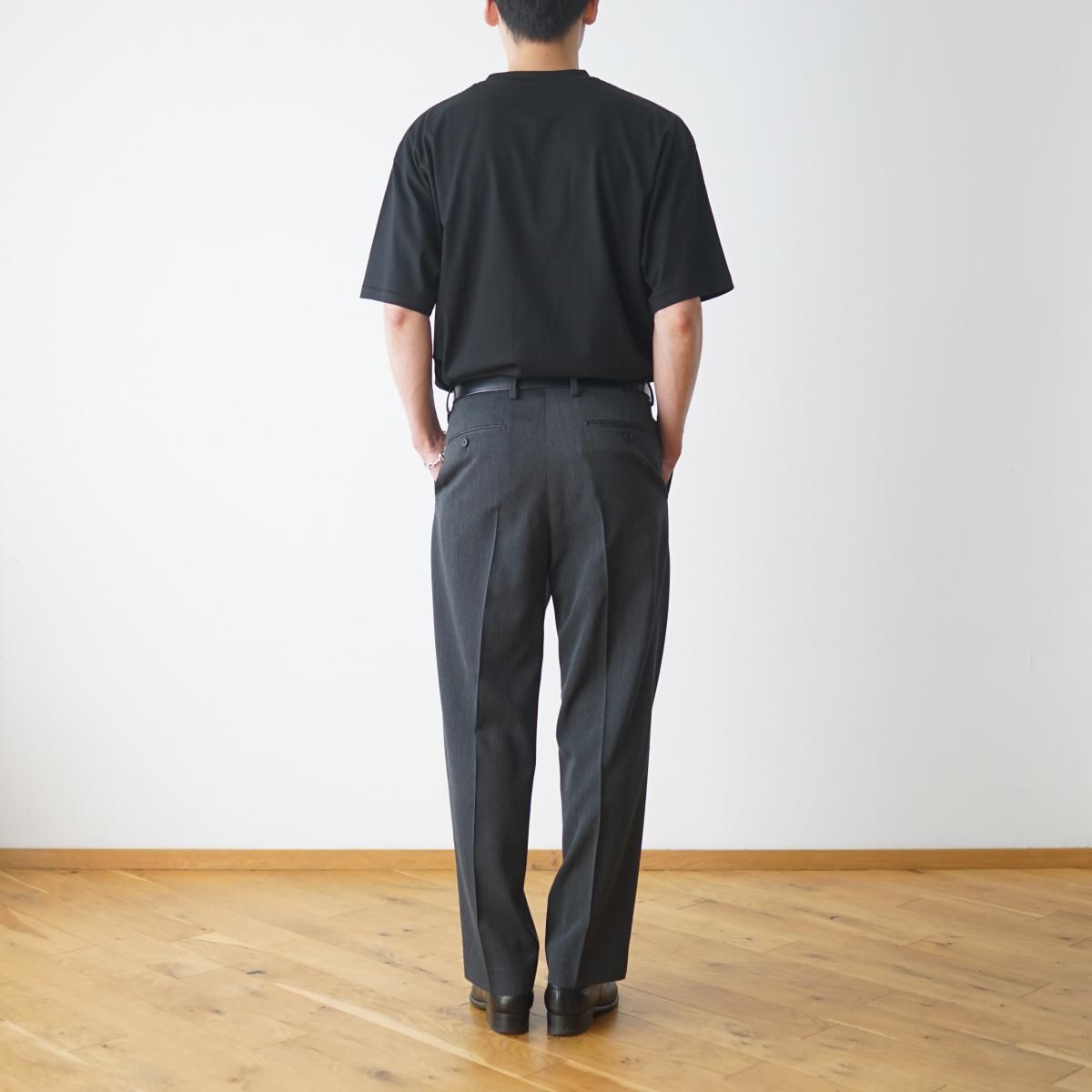 撚りを工夫した細番手のウールをトリコチン組織にすることで、肉感がありながら落ち感のある素材に仕上げました。ワンタックの腰履きのストレートシルエットです。
