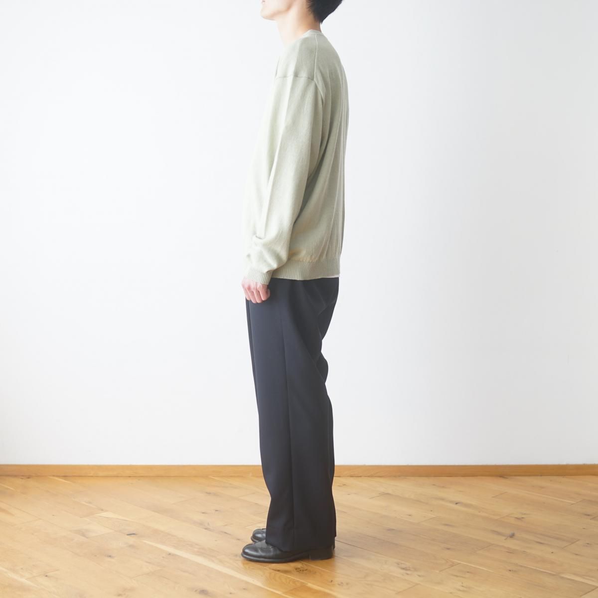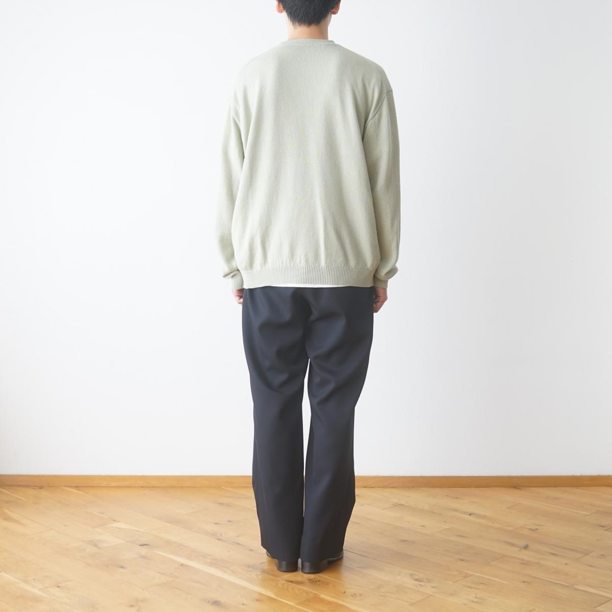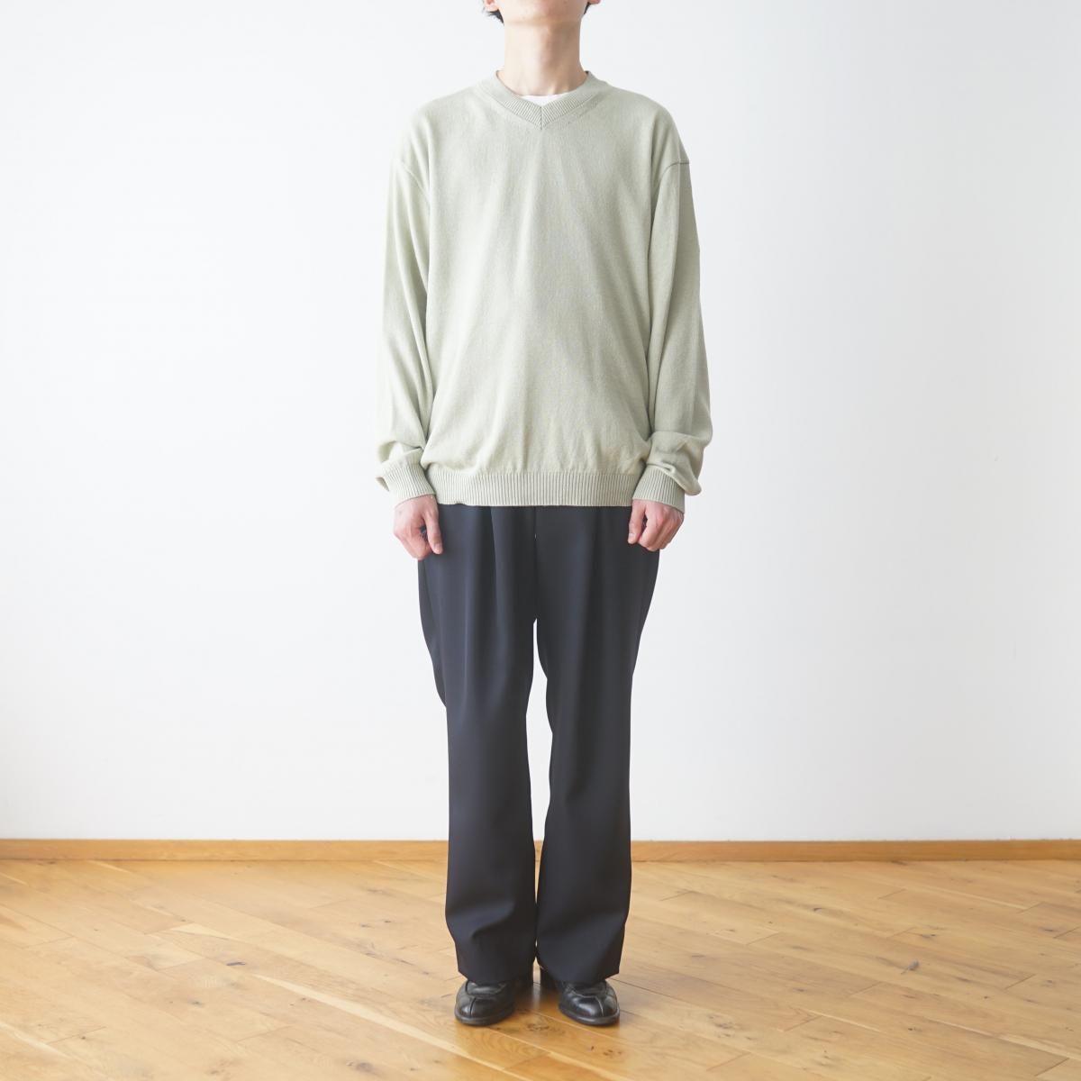 程良いリラックス感が特徴のVネックセーター。天竺10ゲージを採用し、やや度詰めでしっかりとした肉感と着心地に仕上げました。衿は太めのリブダブル付けで、裾リブが締まりすぎておらず、カットソーのようなシルエットを採用しています。