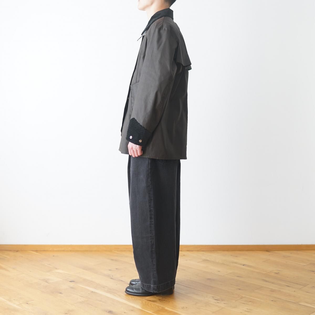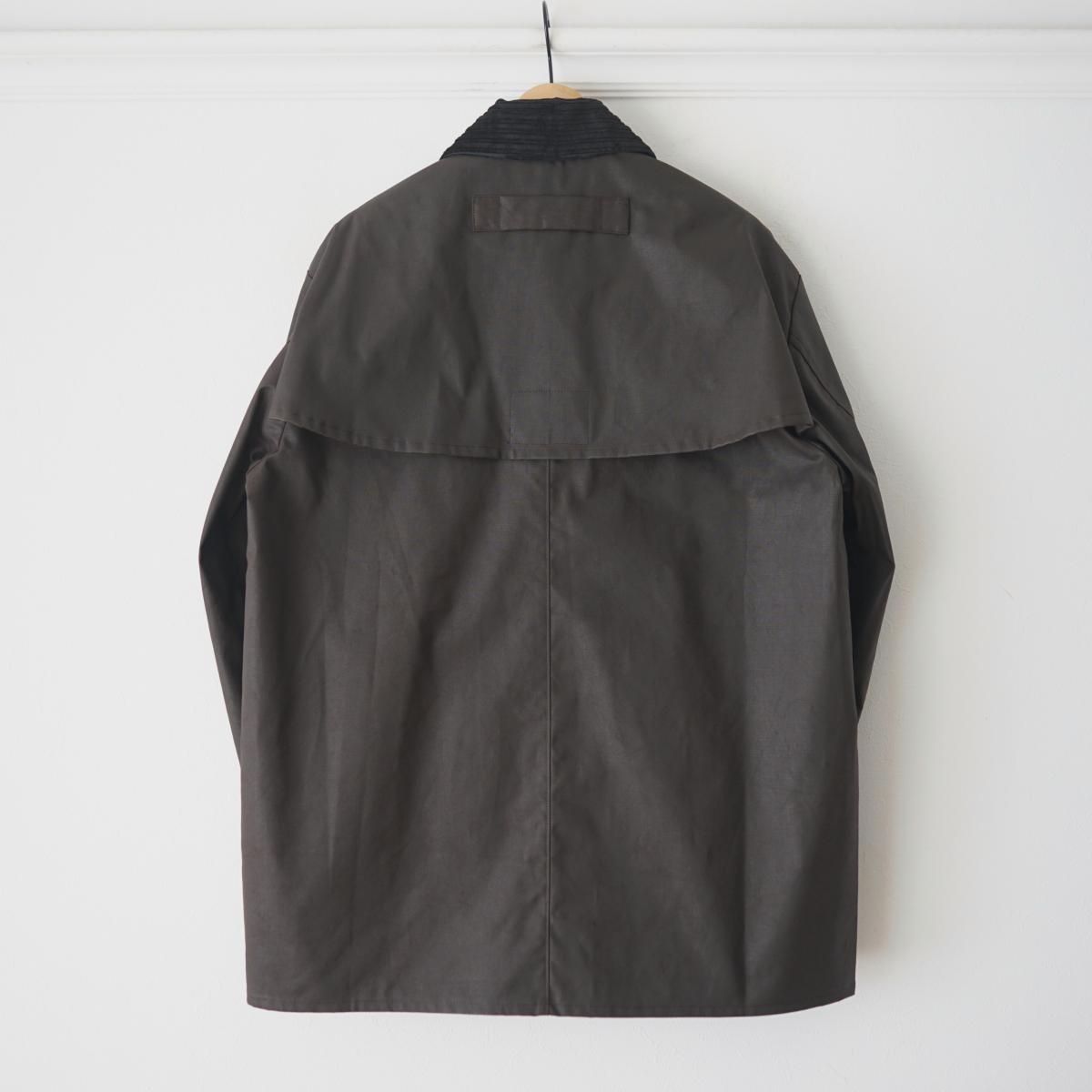 レザー調のコーティング加工を施したコットンキャンバス生地を使用し、軽やかながらもハリ感のある肌触りで、着込むほどに味わいを増します。