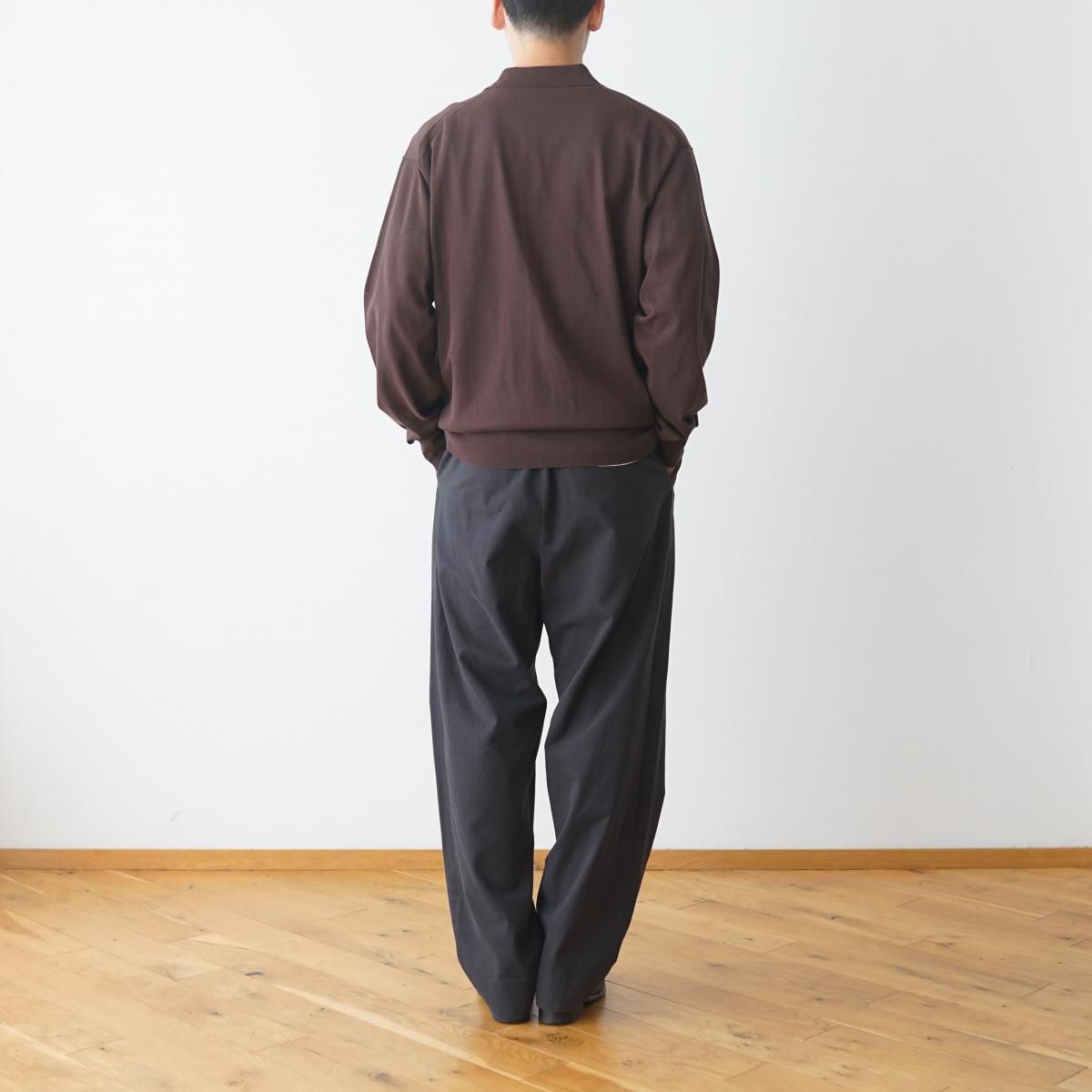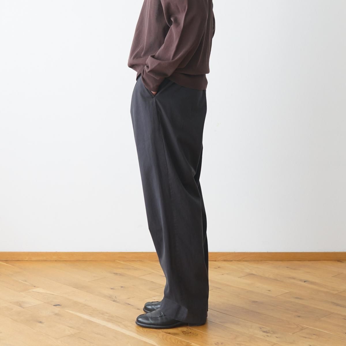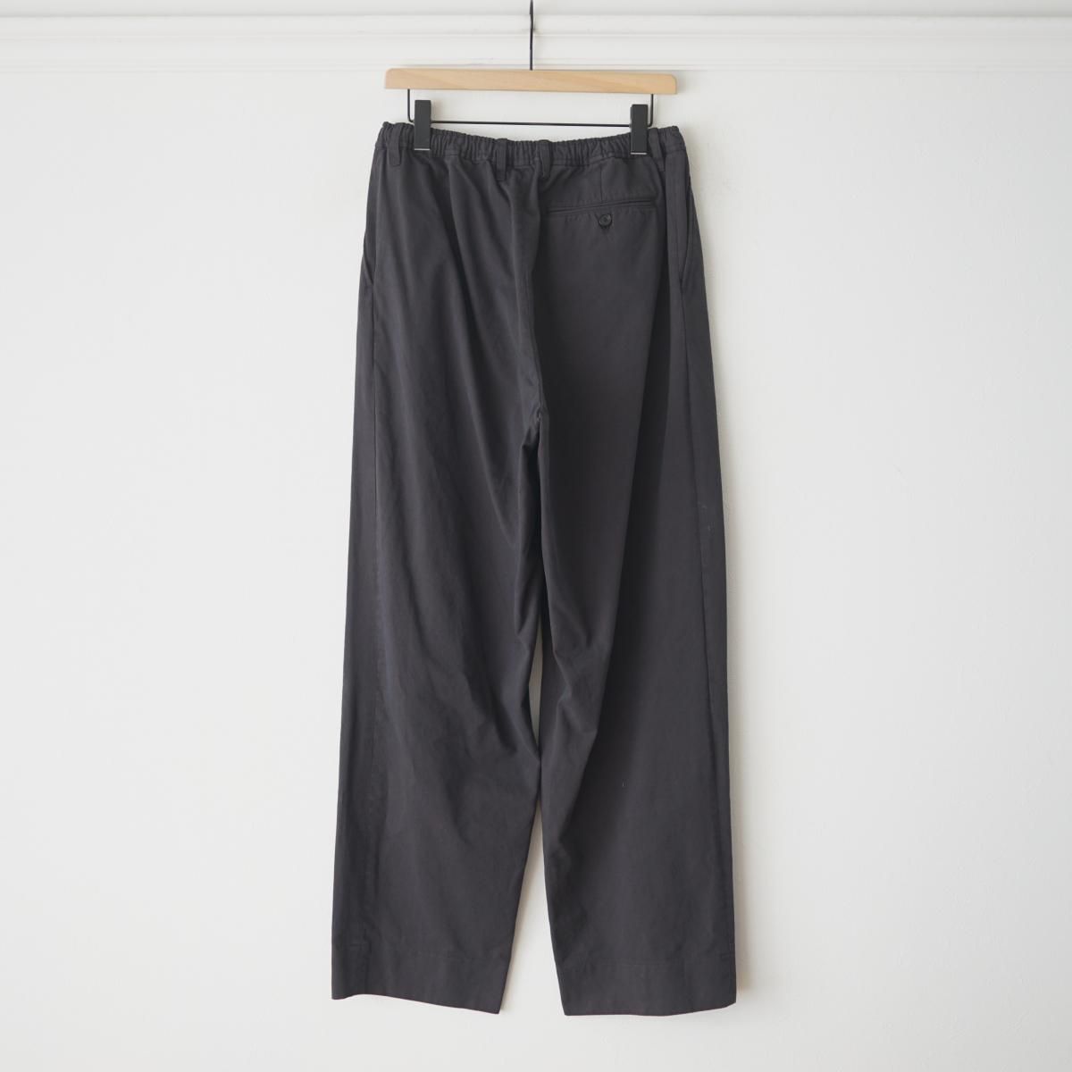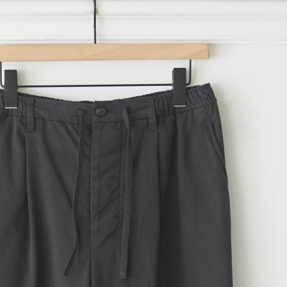 The CLASIK の WORK TROUSER です。ウエストはドローコード使用とカジュアルですがベルトループが付属しており、着用してみるとスラックスのような上品なシルエットになっております。生地が良く動くことやウエストのダーツを利用したポケットもシンプルなデザインなので、より生地の良さが際立ちます。着脱が容易ですし快適な着心地なのでオールシーズンご着用頂けます。