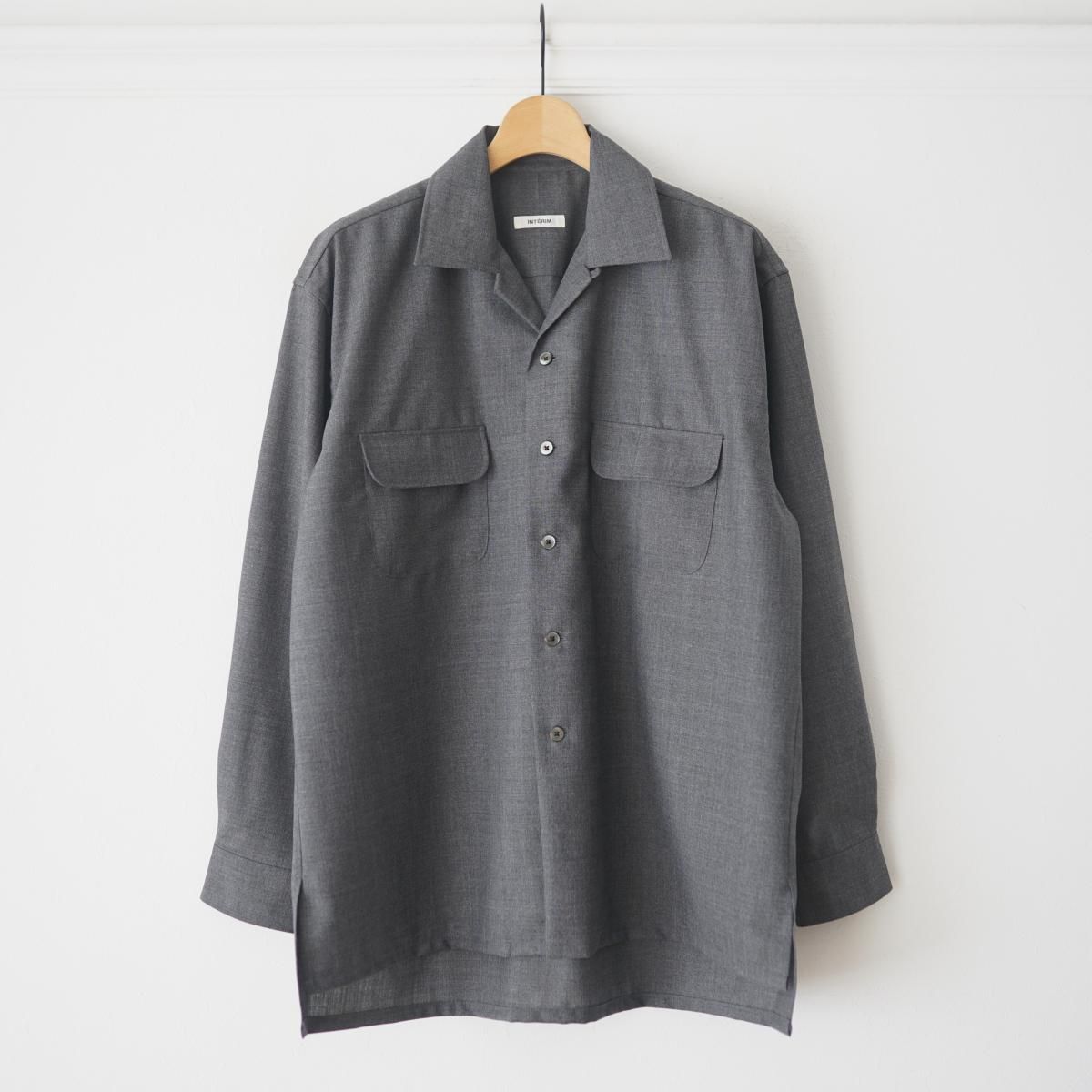 1960年代の日本製TOWN CRAFTをモチーフにしたオープンカラーのウールシャツを、ハイパービッグサイズで仕立てました。イタリアの老舗ファブリックメーカー・カノニコ社の定番である21μのラスティックトロピカル生地を使用。ジャケットやコートをイメージしたサイズ感のため、襟裏にはハンガーループが付きます。両胸には丸みのあるフラップポケットを、前たてとカフスには黒蝶貝の大振りなボタンを採用しました。国内のドレスシャツ専業工場で縫製を行い、襟先にハリを出すため取り外し可能なカラーキーパーを入れています。
