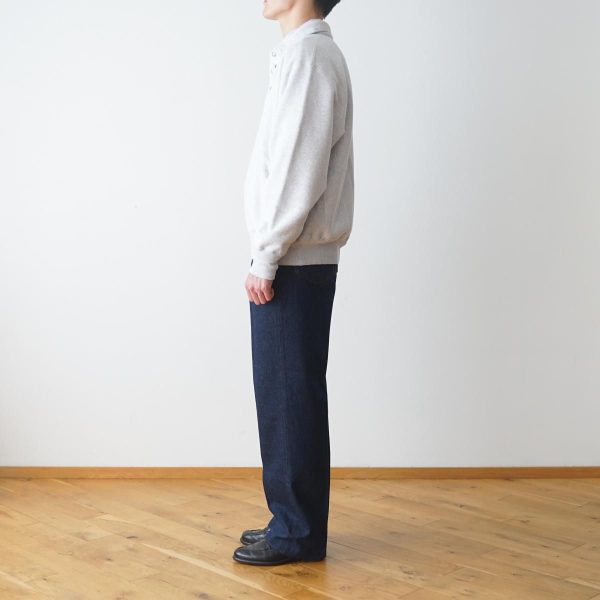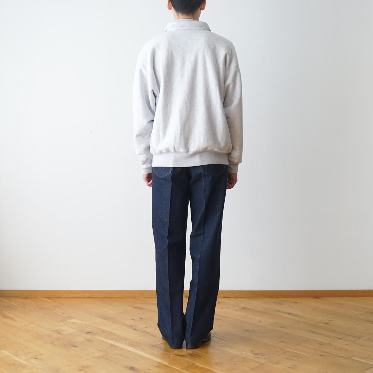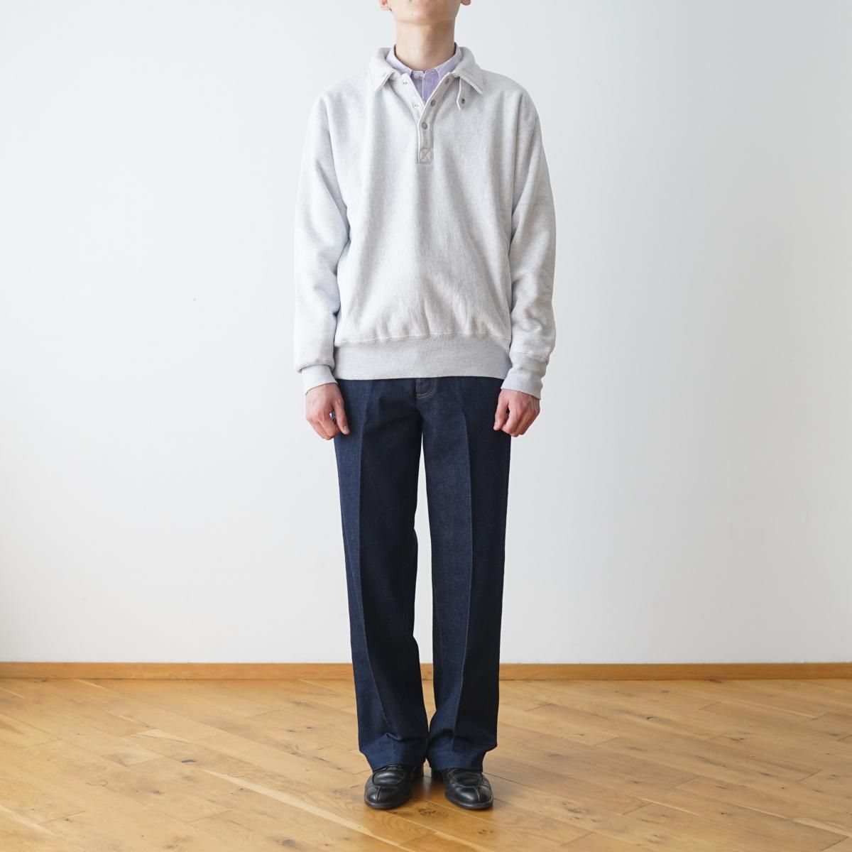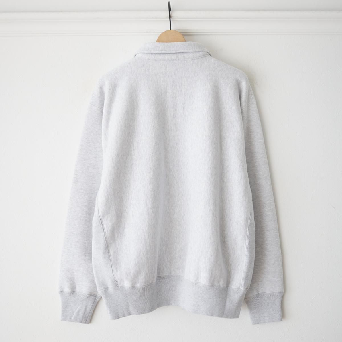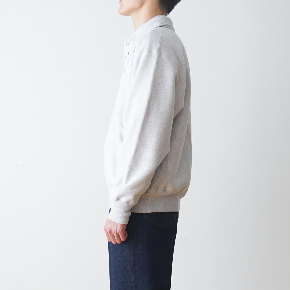しっかり目が詰まった裏毛に、ライトグレーは生地でブリーチを入れて通常の色展開にはない薄いトップグレーを。チャコールは製品でブリーチ加工を入れて古着っぽいイメージで仕上げました。スナップボタン仕様の襟付きプルオーバーです。