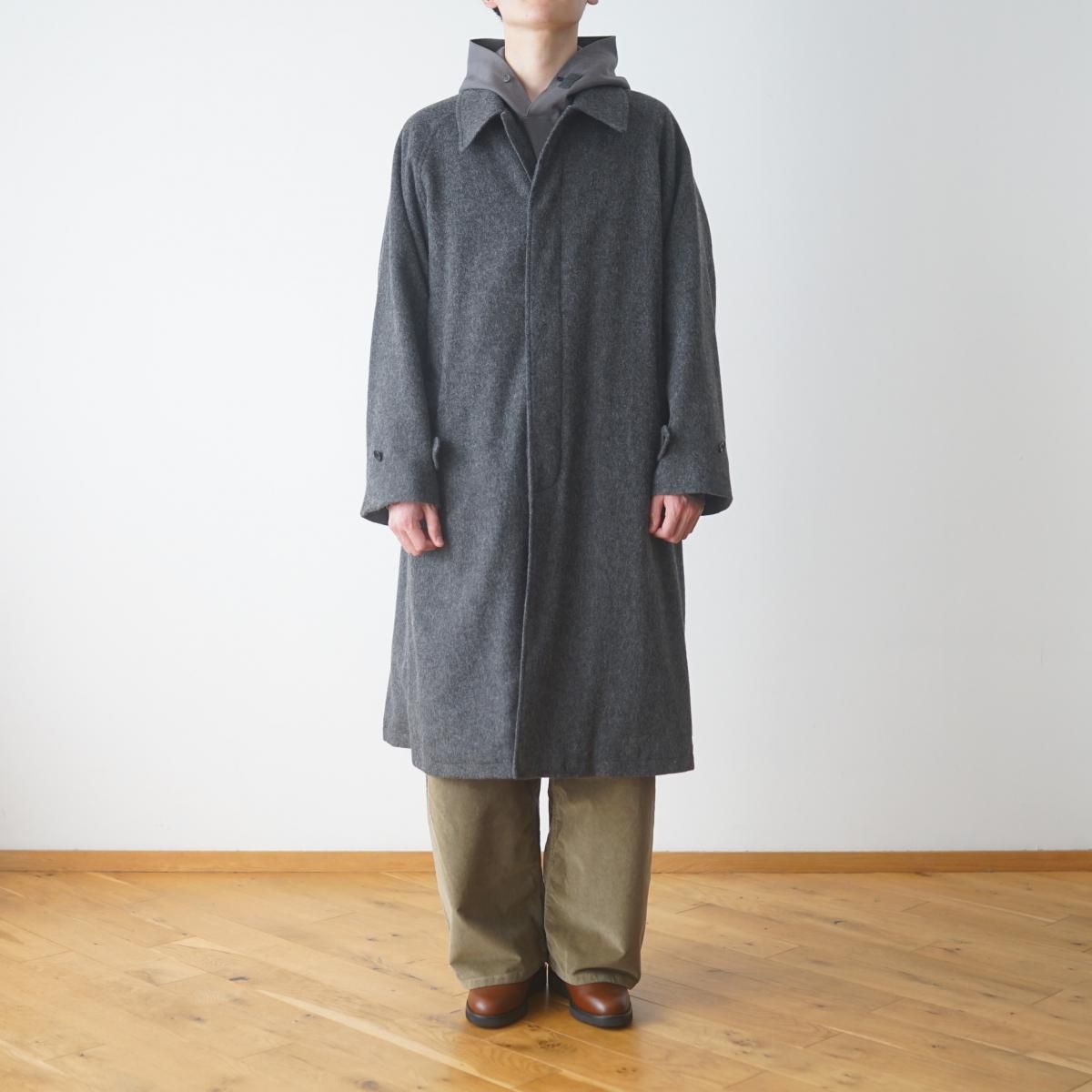 リサイクルウールによる軽さとメランジカラーが特徴の起毛平織り生地を使用しています。起毛された平織り生地は、ふんわりとした柔らかさと温かみがあり、冬のアウターとして心地よく身体を包み込みます。ウール本来の保温性を活かしつつも、リサイクル素材ならではの軽量感が日常使いに最適です。