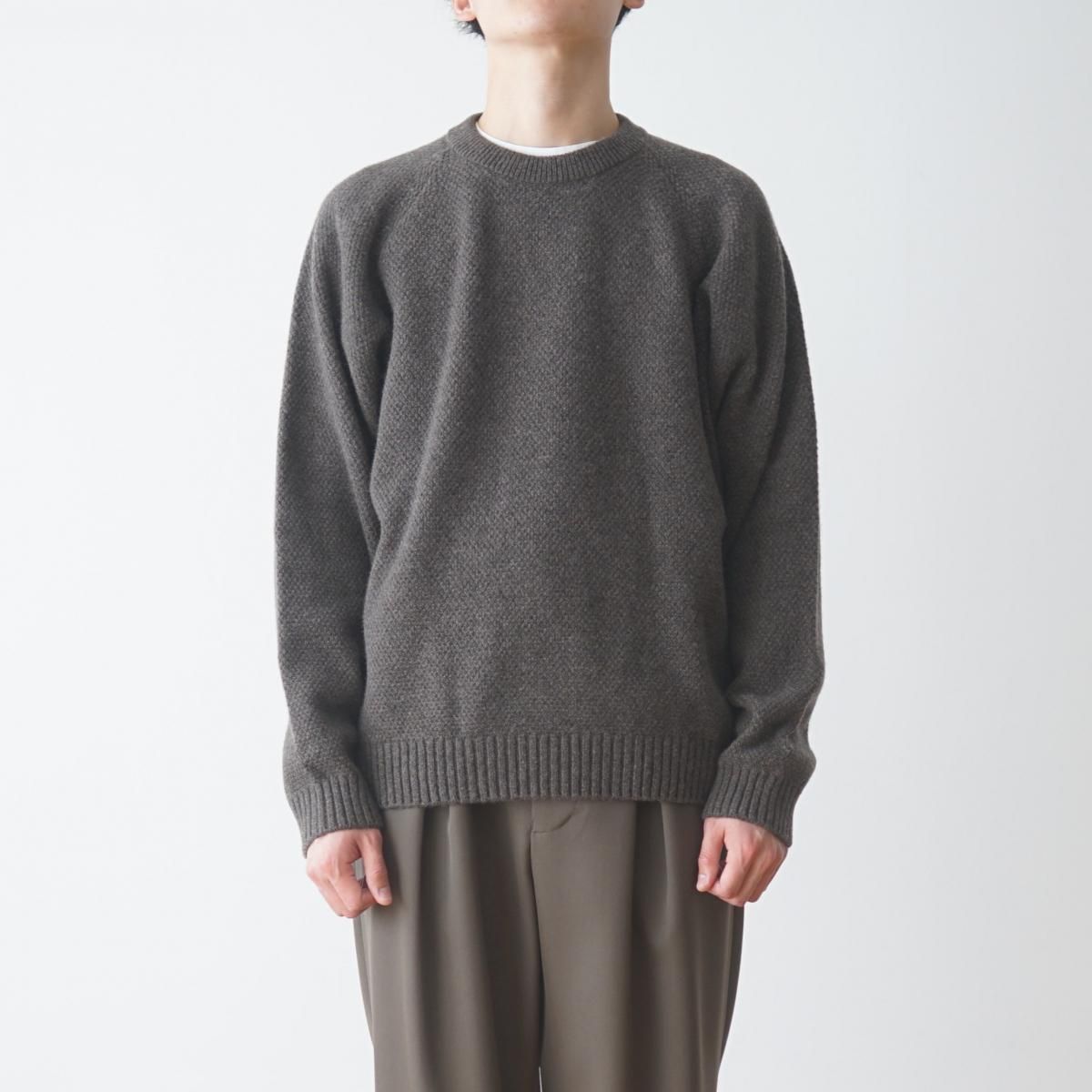 程良いリラックス感が特徴のラグランスリーブのクルーネックセーター。7ゲージを採用し、適正度目で膨らみある着心地に仕上げました。表情ある鹿の子組織が特徴です。衿は、リブダブル付けを採用しています。裾のリブが締まりすぎておらず、カットソーのようなシルエットを採用しています。