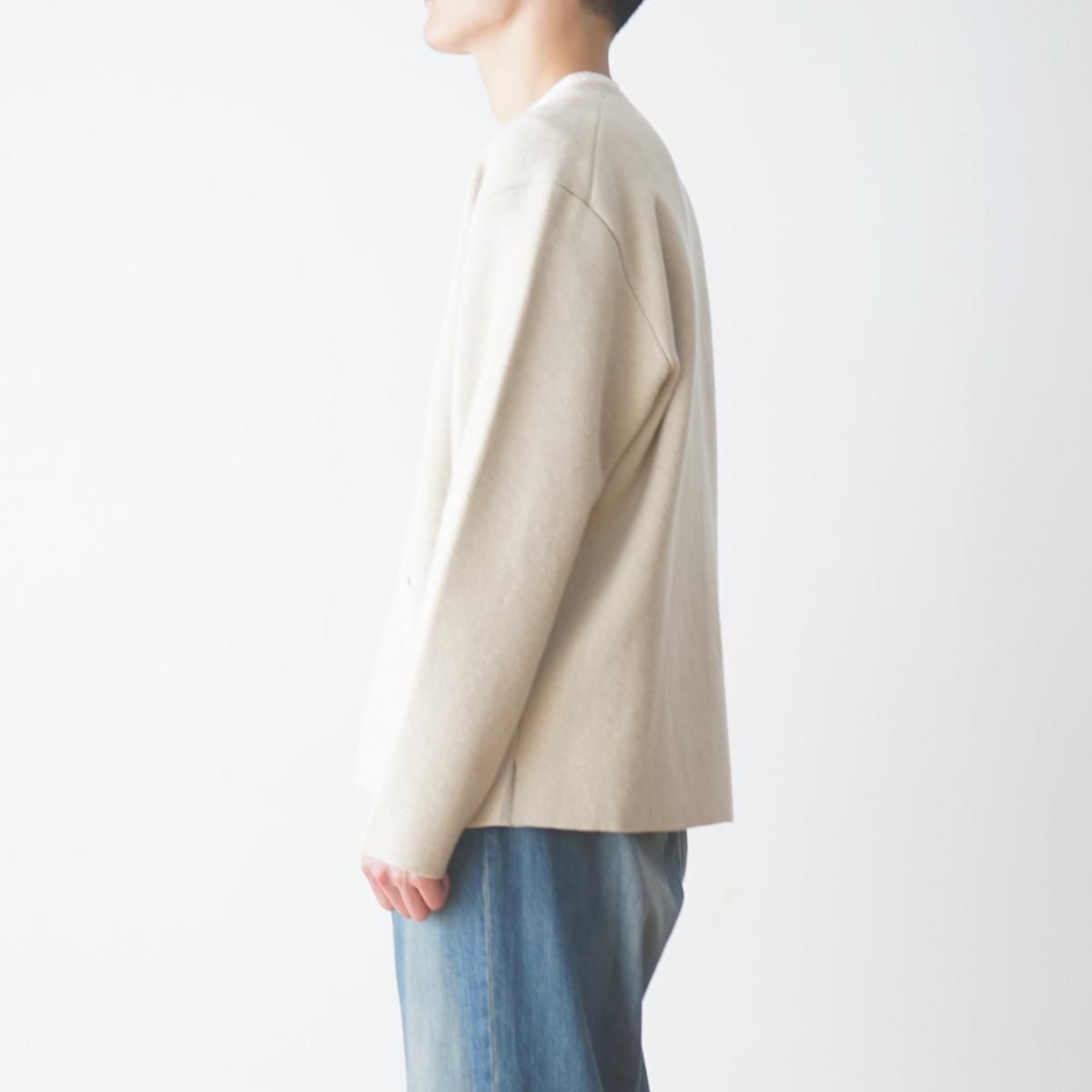 The CLASIK の V-NECK CARDIGAN です。フロントのVをやや深めに設計し、袖口や裾を絞らないことで、テーラードジャケットのような上品な印象のカーディガンです。大きめの水牛マーブルボタンをアクセントに、身幅とアームにややゆとりを持たせたボックスシルエットです。シャツやハイネック等とレイヤードしやすいので、アウターとしてもインナーとしても活躍する汎用性の高い一着です。